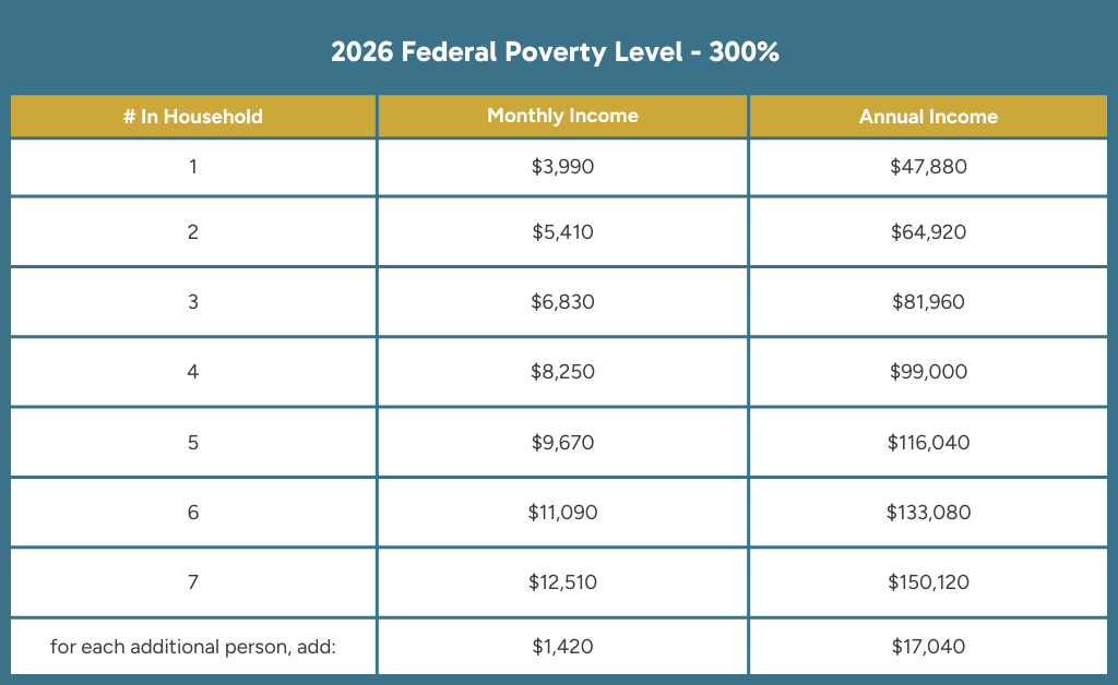 • Income at or below 300% of the Federal Poverty Level